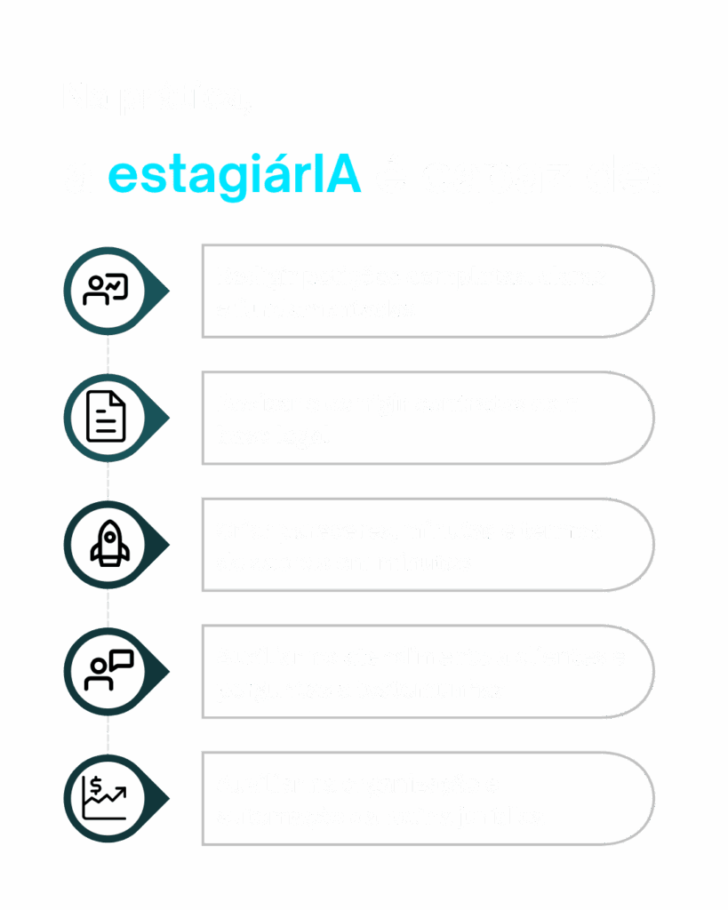 A EstagiárIA foi criada exatamente para preencher essa lacuna. Ela possui treinamento jurídico específico, comandos profissionais e estratégicos.