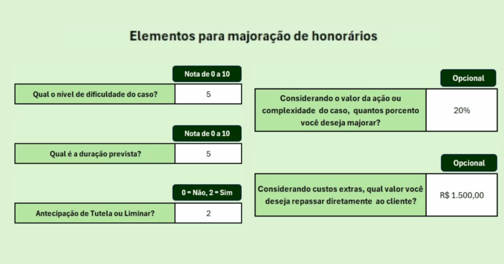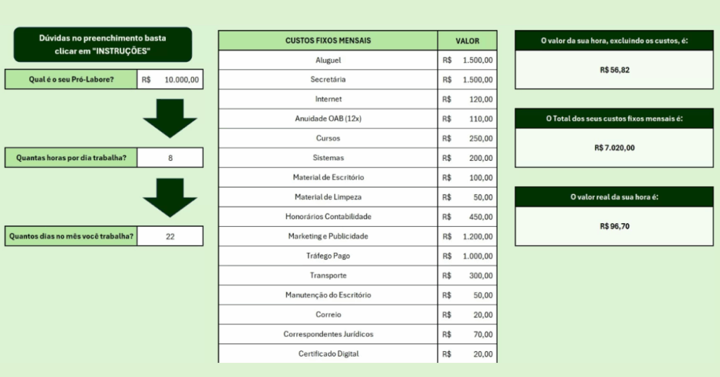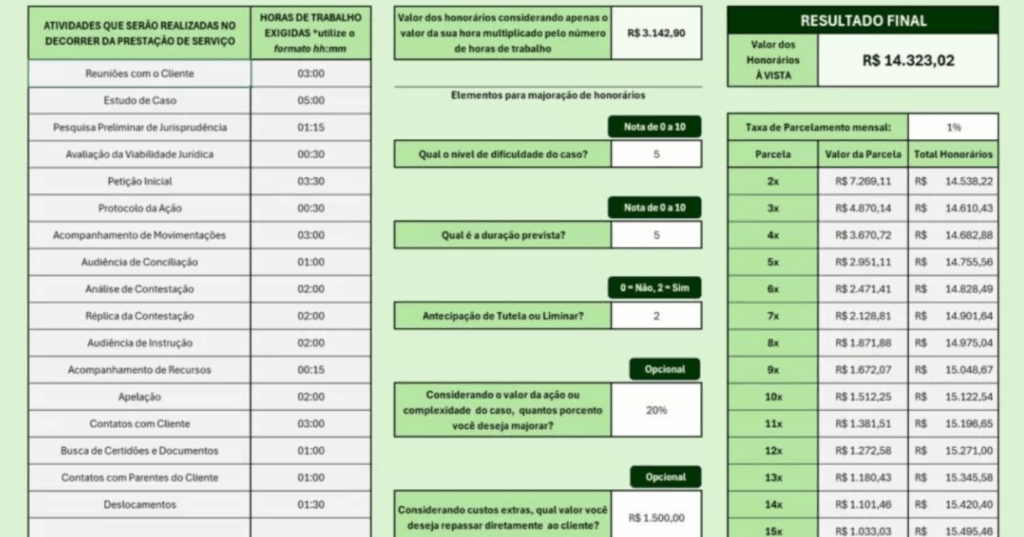 Com a vivência prática da rotina jurídica e visão estratégica de negócios, ela desenvolveu esta planilha em parceria com um especialista na área, com o objetivo de facilitar o seu dia a dia e oferecer um método simples e eficaz para precificar corretamente seus honorários.