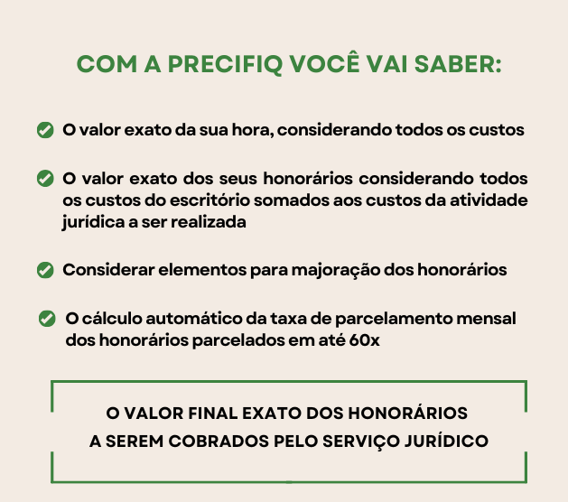 Se o seu dia é corrido e você perde tempo tentando calcular honorários “no olho” ou refazendo contas... A PrecifiQ automatiza esse processo. Você ganha tempo, reduz retrabalho e ainda garante uma cobrança justa em cada caso.